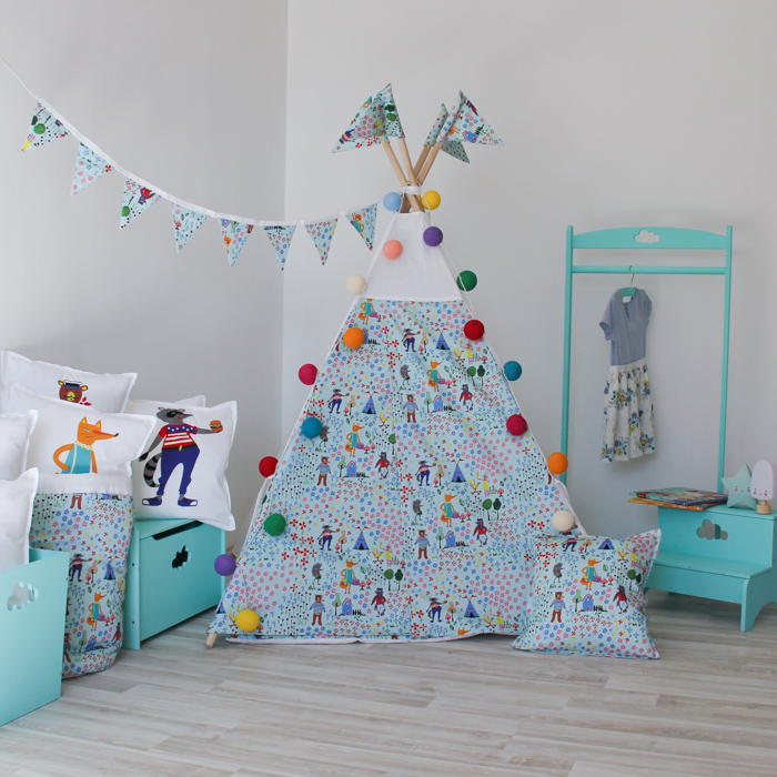 - Декоративная подушка из той же ткани, что и вигвам. Размер по умолчанию 40 х 40 см со съемной наволочкой, но при необходимости можем сшить в любом другом размере. Подушку из другой ткани можно выбрать тут.