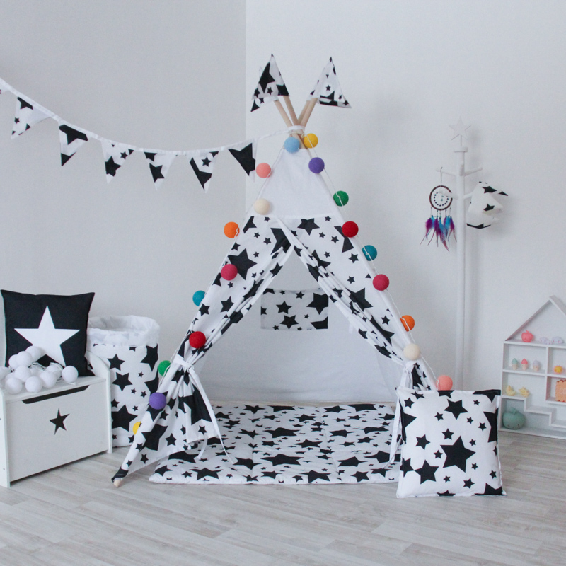 - Тайская гирлянда для украшения и подсветки детского вигвама. Один из самых популярных аксессуаров. Тайские фонарики не нагреваются, не вызывают аллергии (так как сделаны вручную их хлопковой нити) и легко выпрямляются палочкой от суши, если вдруг ребенок их помял. Тайская гирлянда создаст вечерний уют и украсит собой интерьер детской комнаты. Выбрать можно тут.