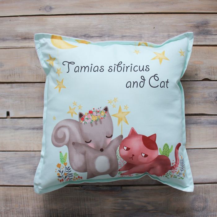 В вашей уютной детской могут поселиться вот такие милые герои, бурундучок и котёнок. Эти неразлучные друзья любят резвиться на лужайке. Подушечке с этими персонажами обрадуется любой ребёнок, ведь можно придумать столько интересных историй. Подобные игры отлично развивают творческое мышление и фантазию.