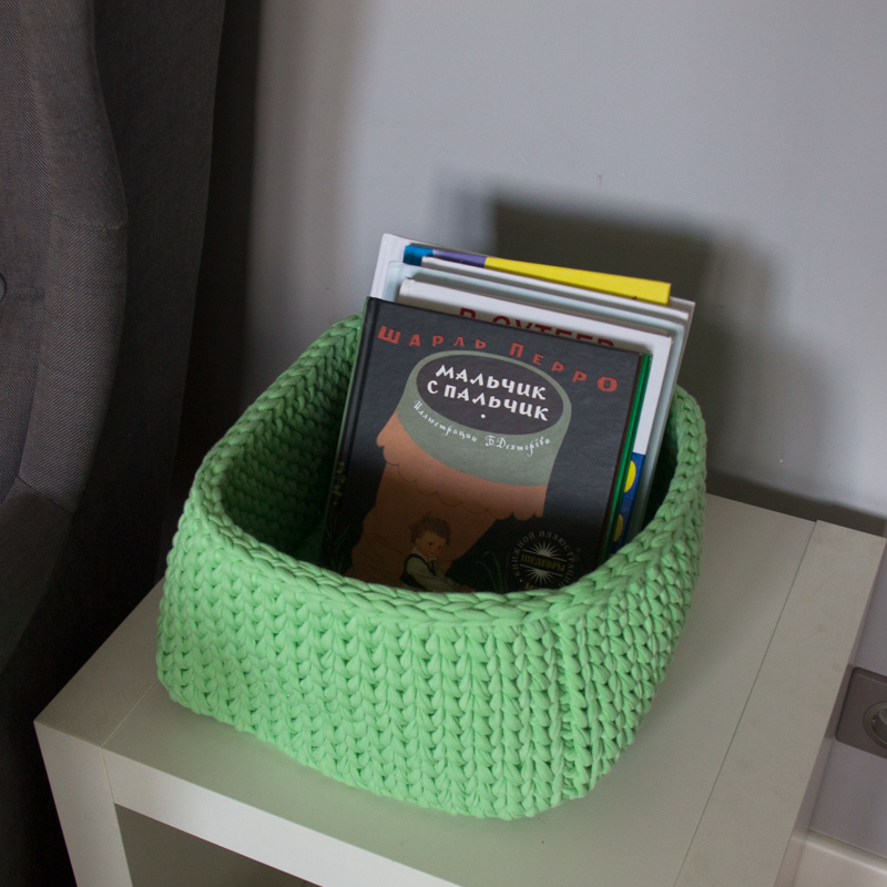 Вязаная корзина для игрушек ручной работы из экологичных натуральных материалов.