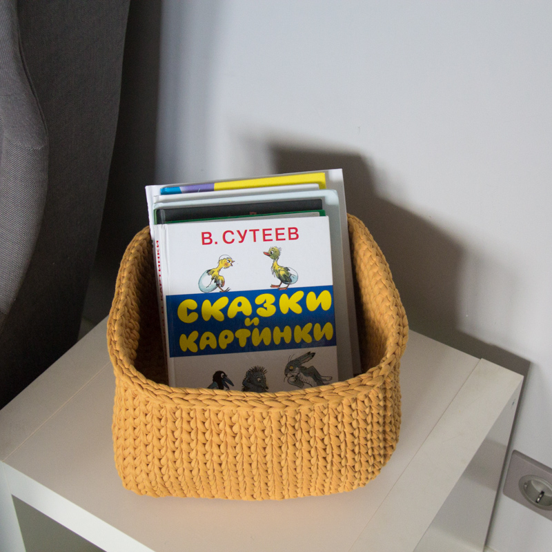 Вязаная корзина для игрушек ручной работы из экологичных натуральных материалов.