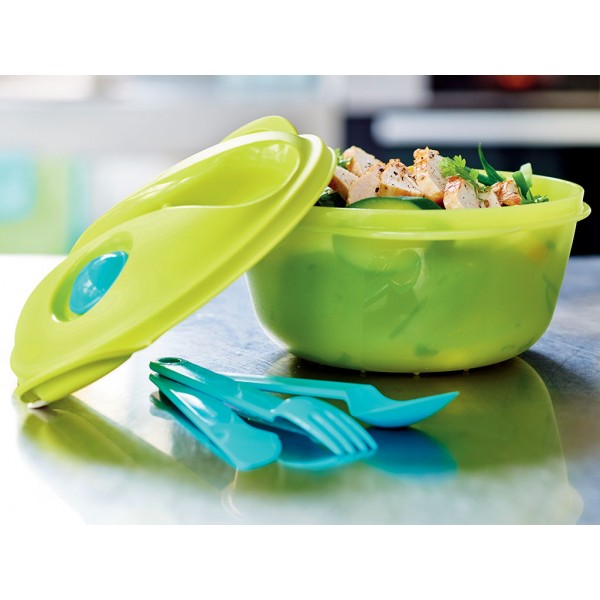 На крышке основной чаши есть удобные углубления для стаканчика, вилки и ножа. После приема пищи, если нет времени вымыть посуду, приборы и стаканчик можно аккуратно сложить в чашу для транспортировки. Как и любая пластиковая посуда Tupperware, чаша оснащена полоской для удобного открывания.