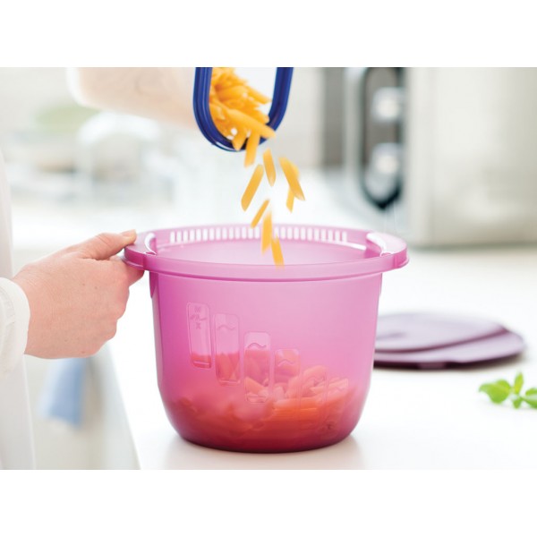 Один контейнер выполняет функции нескольких изделий: емкости для дозировки, варки, дуршлага, сервировочного блюда и емкости для хранения. прямоугольная удобна для варки спагетти, круглая - для мелких макаронных изделий.