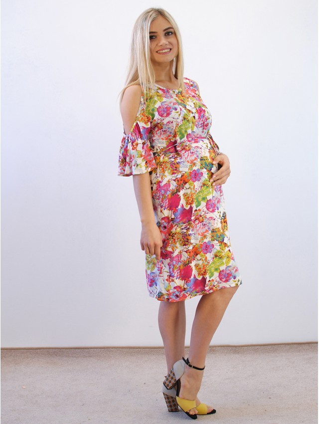 Штапель хорошо пропускает воздух, впитывает влагу и гипоаллергенен для кожи, что так важно в период беременности. Модель средней длины прямого силуэта с пояском из основной ткани. Необычный крой платья придаёт женственности и лёгкости. Платья с вырезами на плечах стали хитом нынешнего сезона!